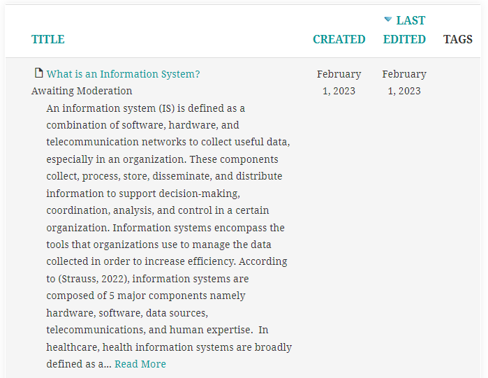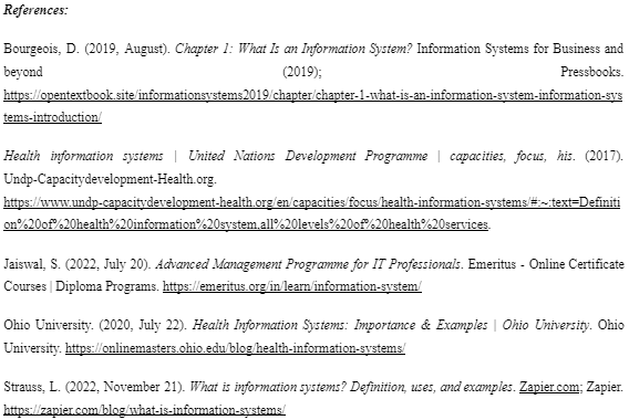 In the simplest way to put it, Information Systems is “information in a system”. However, with more context, information systems allow for not only the recording of important information, but also the deliverance of it for the support of improvement of society who uses it through its management. Reference: Caballero, R. D. (n.d.). Understanding Health Information Systems [PowerPoint slides]. Institute of Clinical Laboratory Sciences, Silliman University. https://drive.google.com/file/d/1NdYf-Rh0w1dV5xq2MgijhgdaPW6JmNEV/view?usp=sharing |